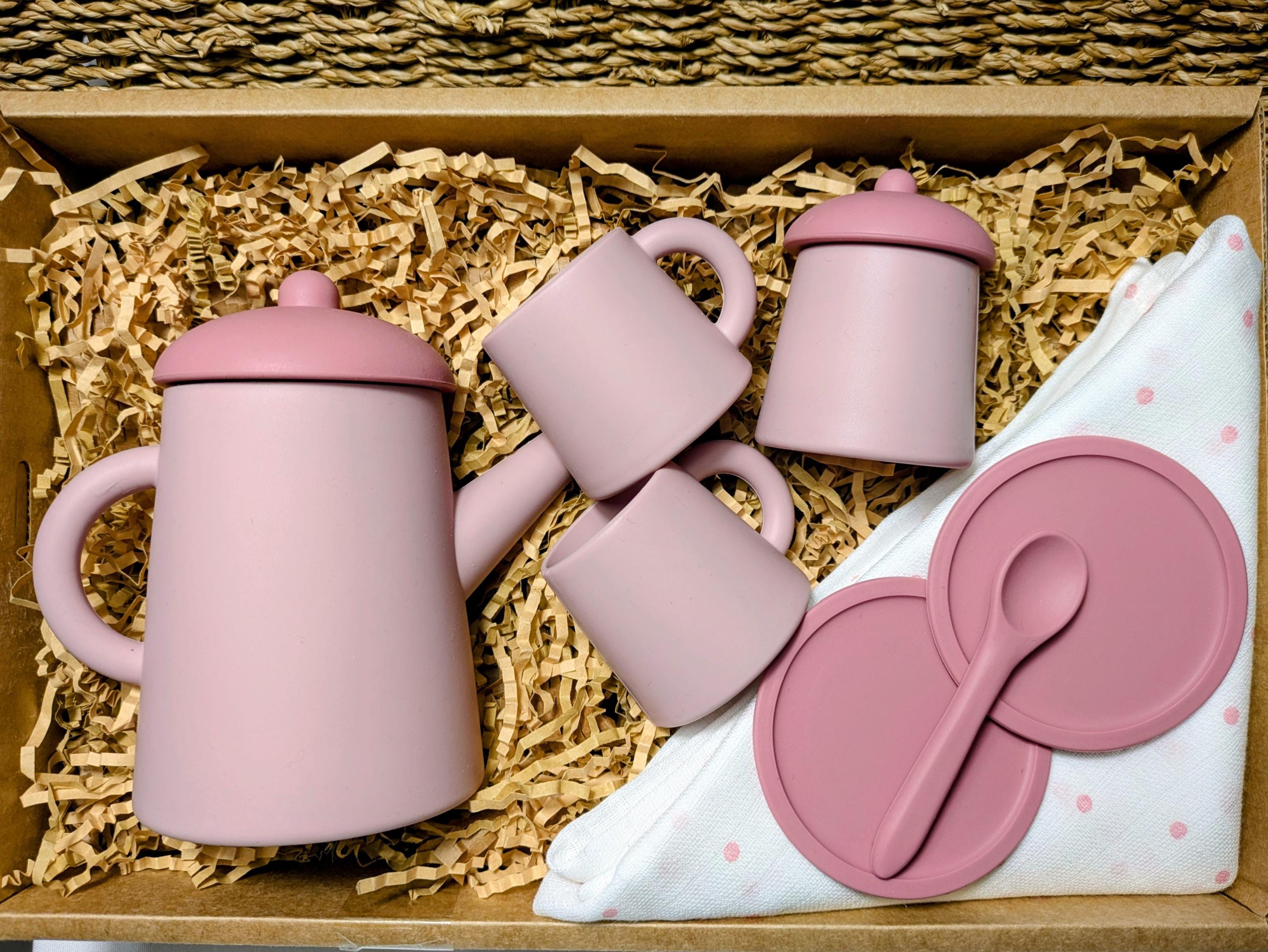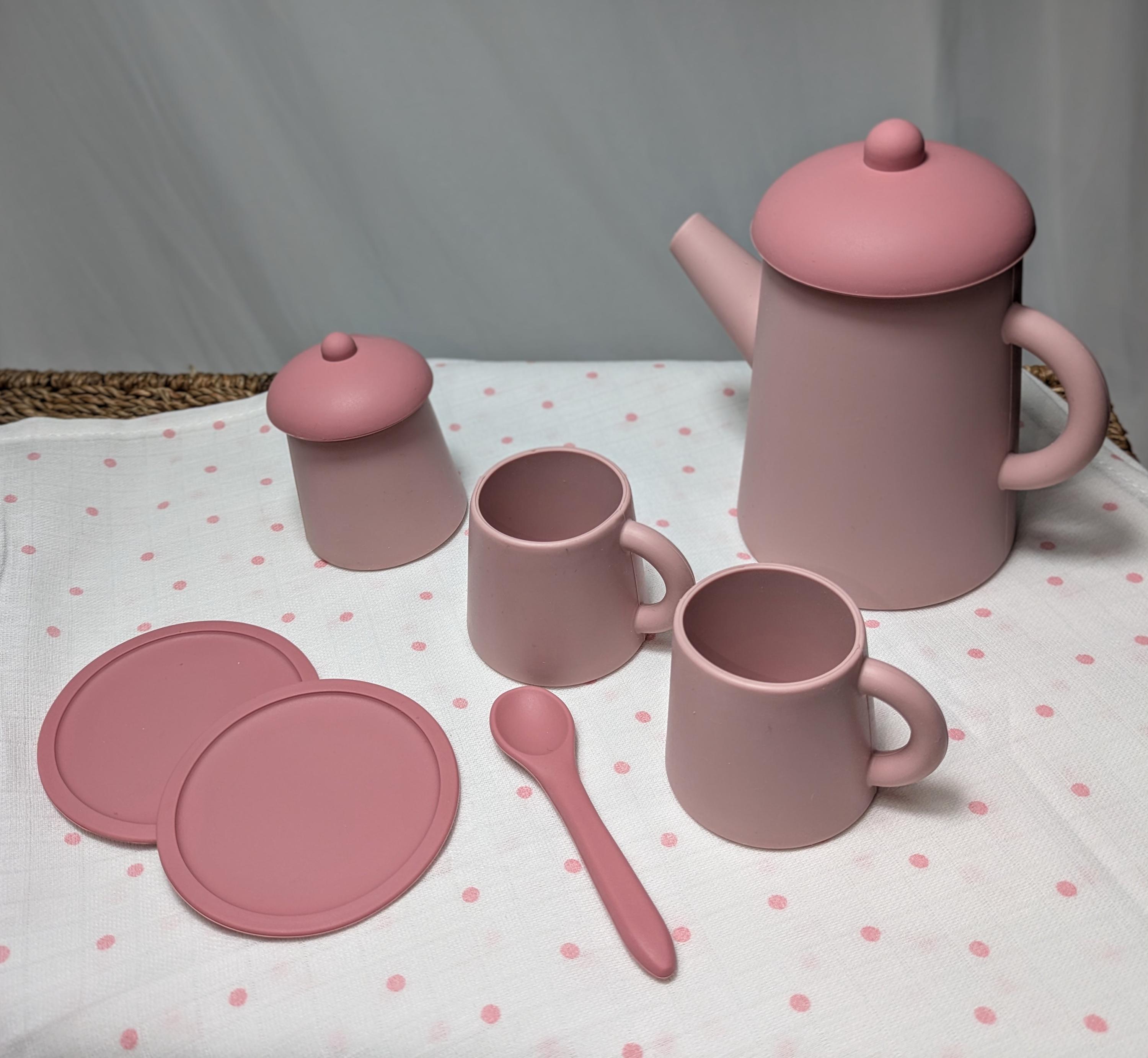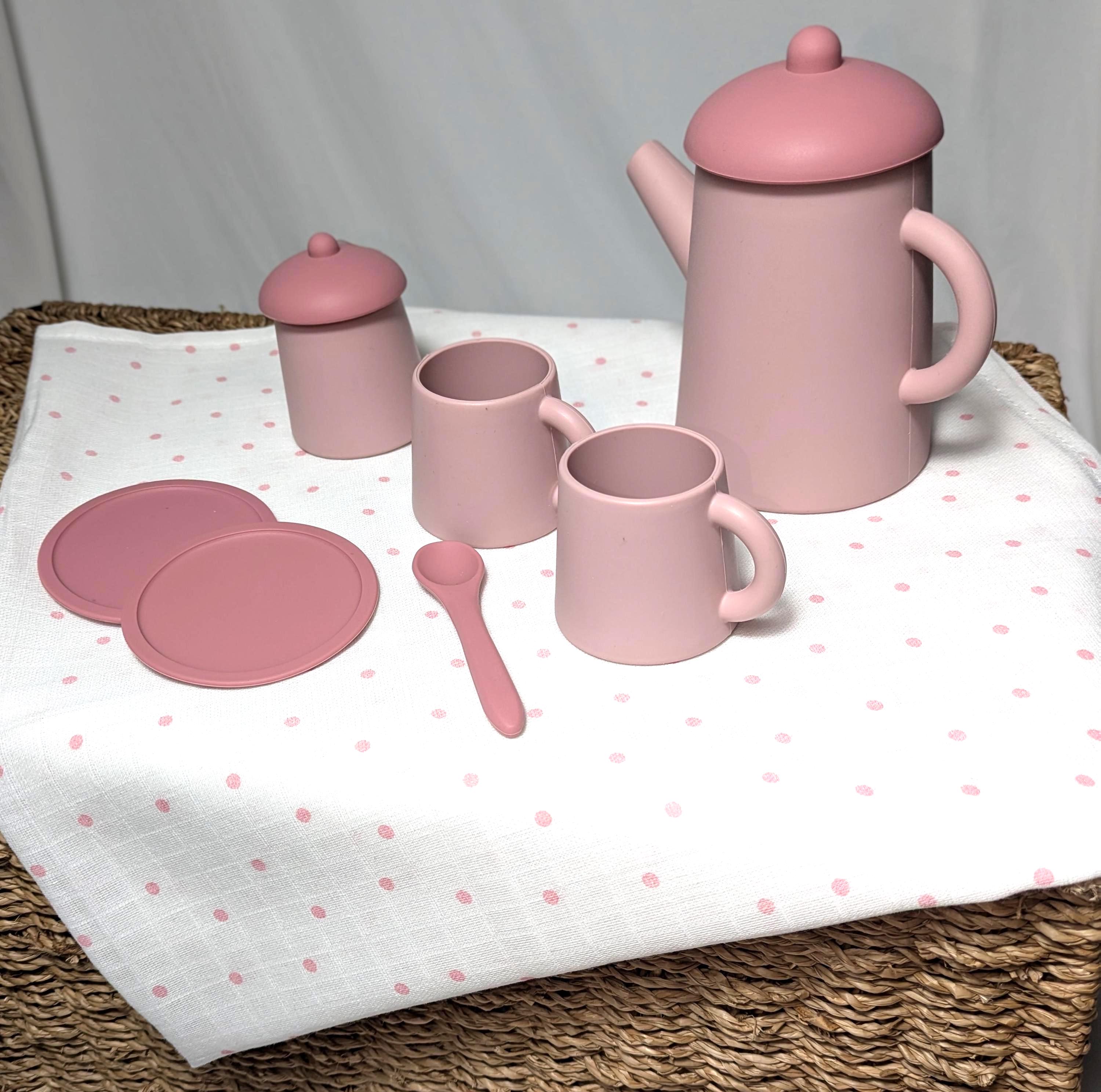 A super cute little tea set for pretend play. Children's will play for hours with their dolls or friends, the perfect set for tea for two. Made with soft silicone, 2 x cups, 2 x saucers, 1 x sugar pot with lid, 1 x tall teapot with lid, 1 x spoon, 1 x white pink polka dot muslin picnic blanket , wl( 100cm x 100cm approx.) Comes Boxed & wrapped in Pink chiffon ribbon. Box measure's 30cm x 20 cm x 8cm approx. This set is recommended for 3 years+.