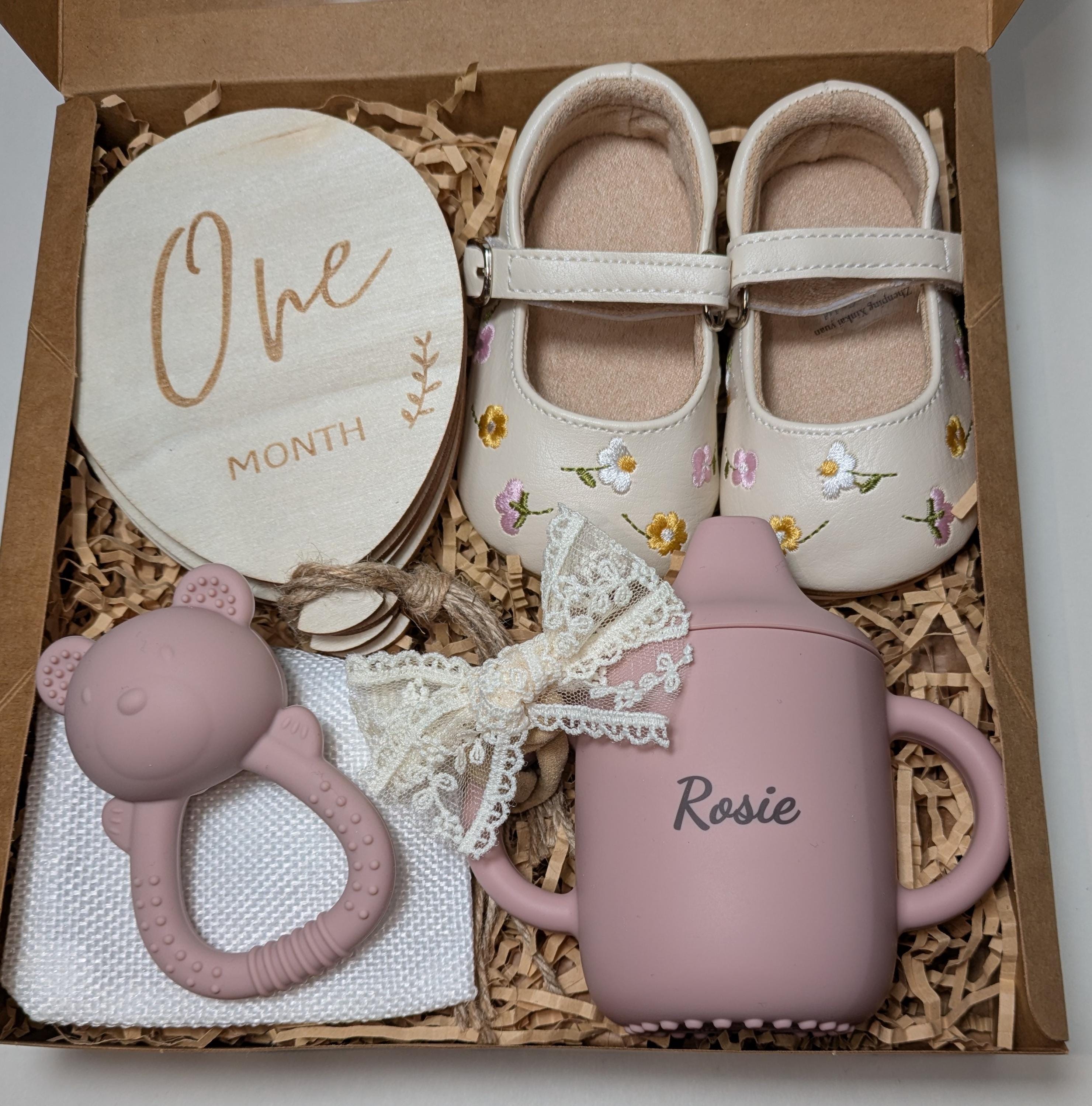 Pink colour theme baby girl gift box. Kraft style gift box with lid and transparent window. The box is approx. 23cm x 23 cm x 8cm. The box is completed with a pink coloured chiffon ribbon. Includes; - 6 wooden, Balloon shape, monthly milestone markers Props for photos with number months on each side. - Pink silicone Sippy cup which can be personalised or plain. Food grade silicone. - Silicone moulded pink bear teether with rattle sounds. Food grade silicone. - Baby girl Shoes for age 0-6 months, Eur size 17/18 - Baby headband, stretchy, cream/white. (headbands may vary from the picture depending on stock)