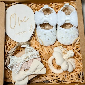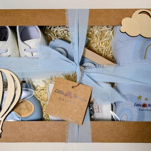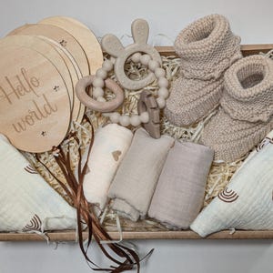 Beige colour baby Boy gift box. Kraft style gift box with lid and transparent window. The box is approx 23cm x 23 cm x 8cm. The box is completed with a Beige coloured chiffon ribbon. Includes; - 6 wooden, Balloon shape, milestone marker Props for photos with number months on each side. - Beige silicone sippy cup, which can be personalised or plain. - Beige Silicone bear shaped teether with rattle sounds. (food grade silicone) - Brown Baby boy Shoes for age 0-6 months, Eur size 19.